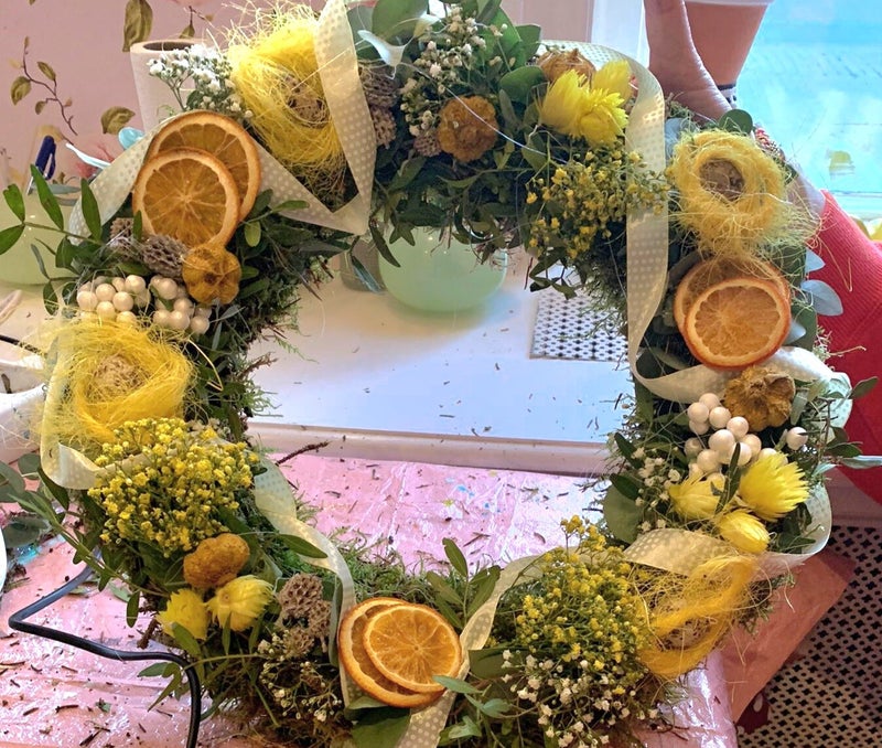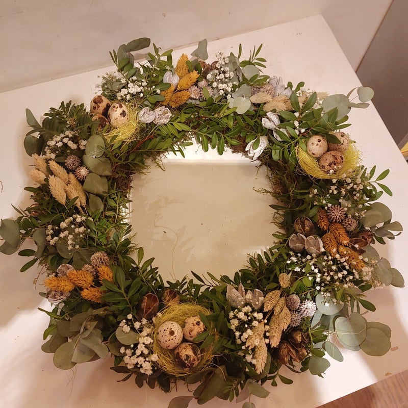 - 4. Voorjaars Krans van droogbloemen (30 cm) € 45,- We gaan een zwarte of goudkleurige ring met droogbloemen opmaken. Je kunt deze ophangen waar je maar wilt. Je kunt het geheel nog afwerken met paaseitjes en eucalyptus net wat je leuk vindt.